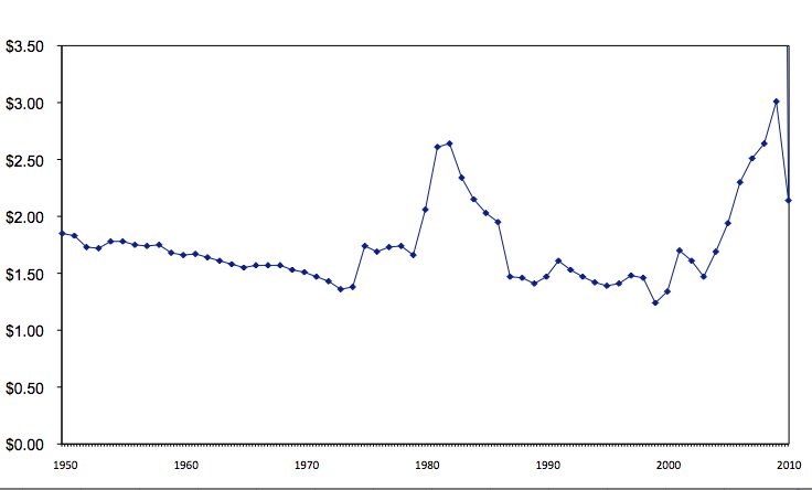 I'm really not complaining about the way the price of gas has risen over the past few years. According to the US Energy Information Administration it really hasn't changed an enormous amount in real terms.* No. What really pisses me off is that oil companies--thanks to their influence over Congress, I assume--can so blatantly disguise the true price of their product. See those little fractions of a cent after the main price--the oil companies, of course, hope you don't. OK, you say, then they're pretty stupid people. So--it's alright to con stupid people out of an extra penny? Get real, Big Oil.
